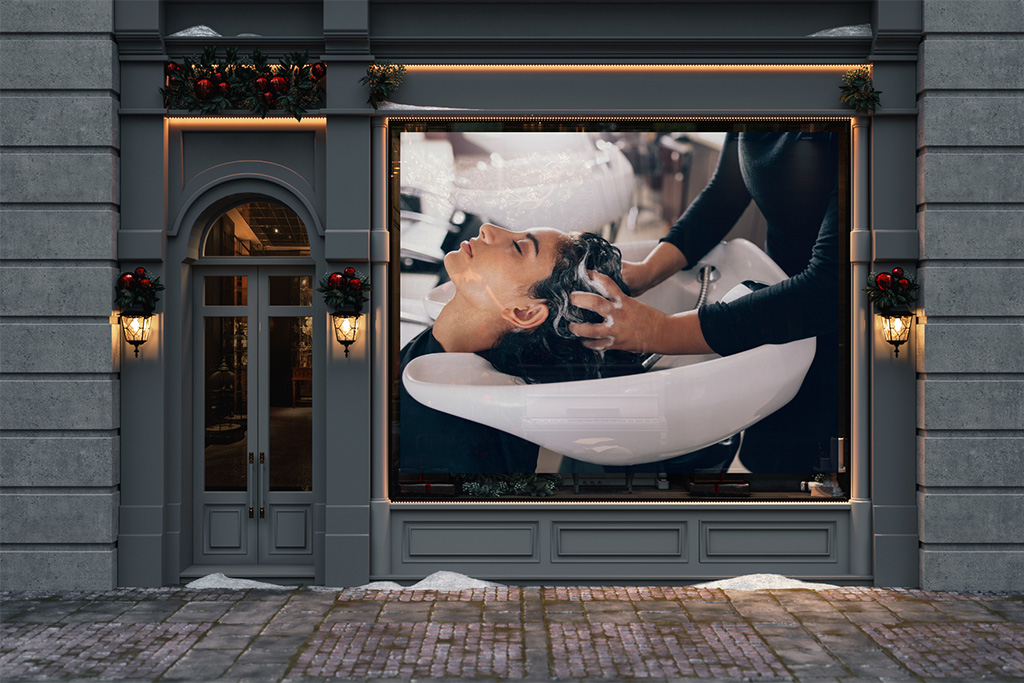 Seasonal window displays are a great way to keep your salon looking modern and up-to-date. During the winter holidays, create a festive display with sparkling lights, holiday-themed decorations, and promotional posters for gift cards or bundled services. In the spring, a floral-themed setup with pastel hues and advertising promoting your “Spring Makeover” package could draw in new clients.